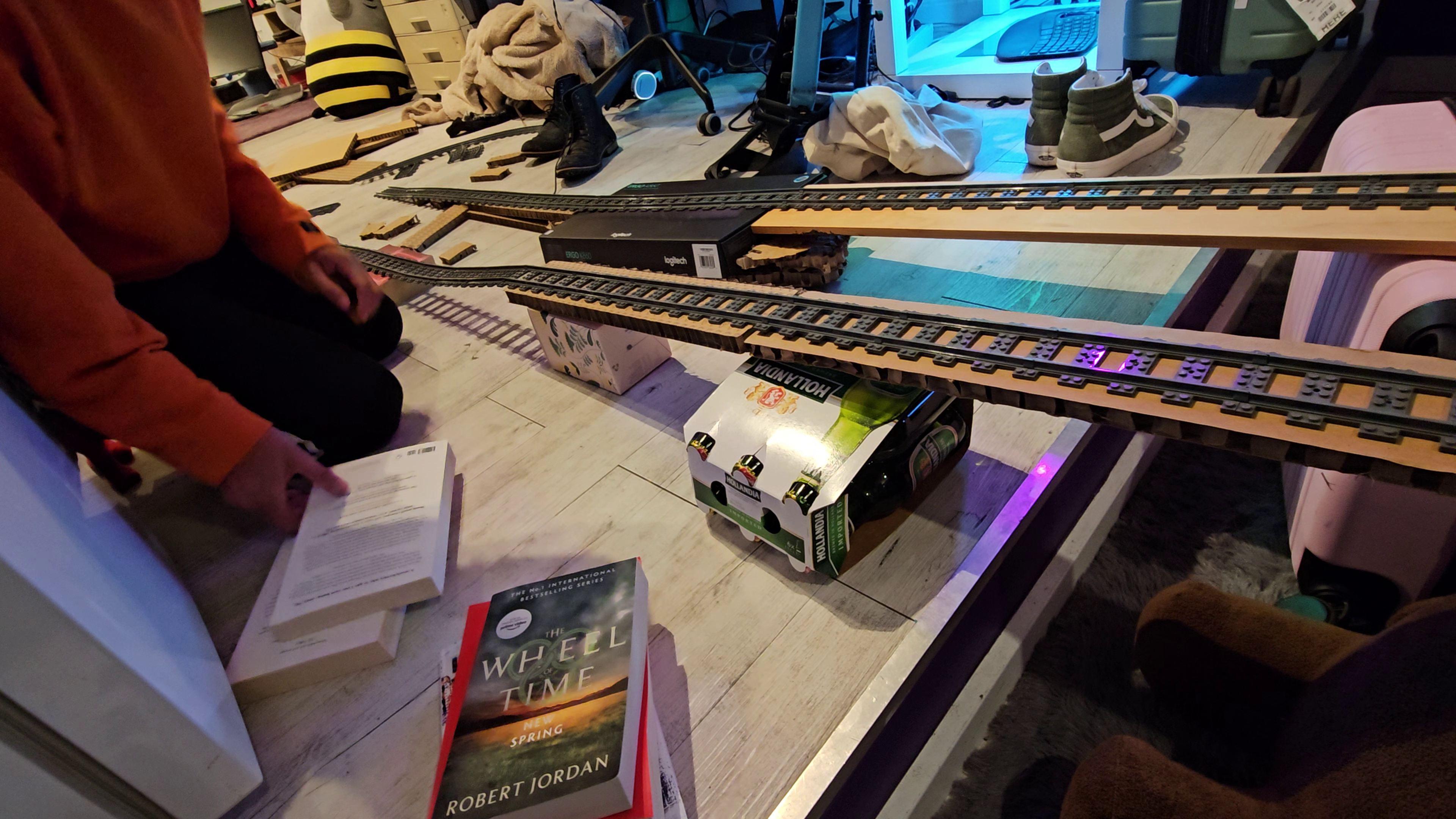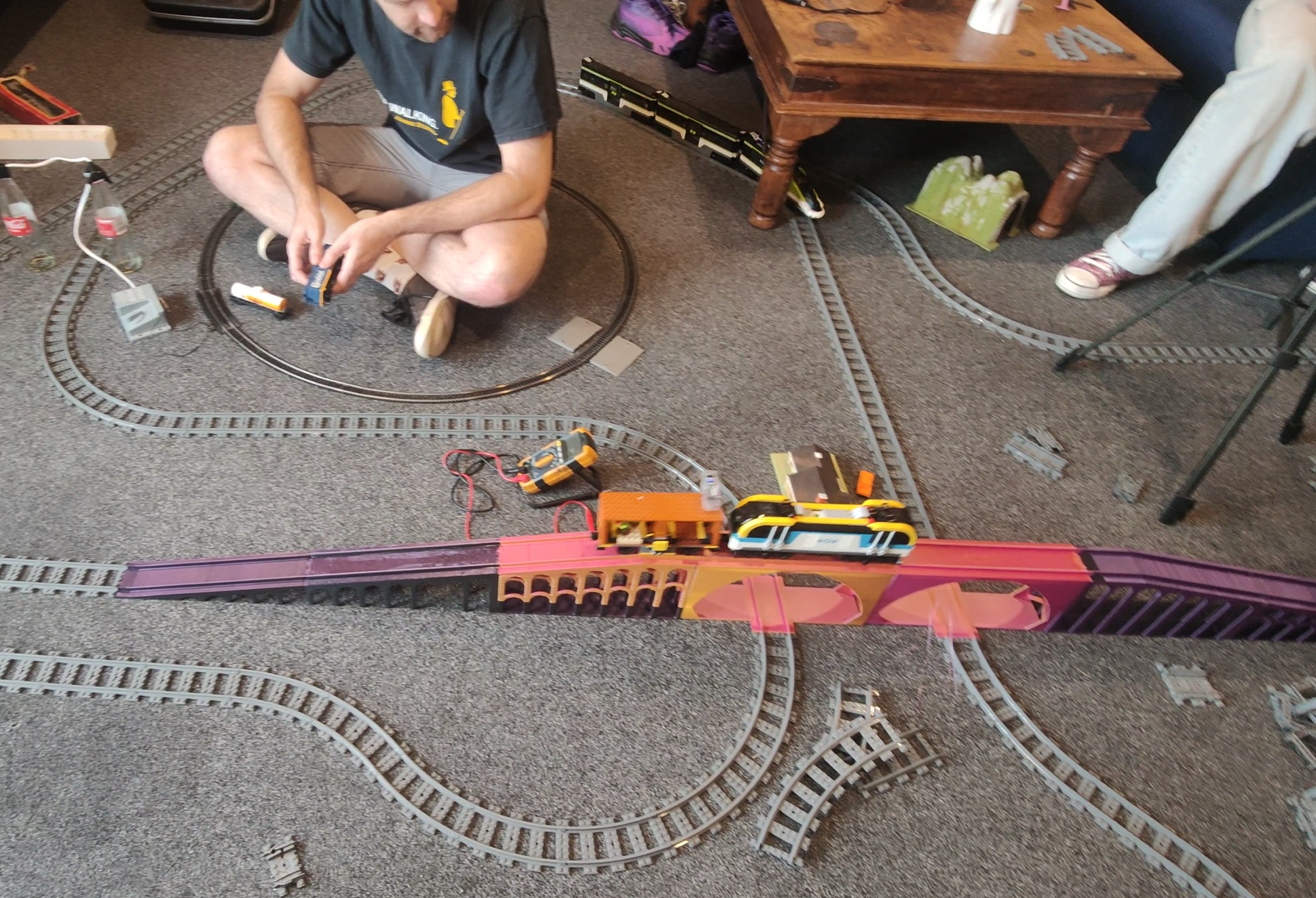 I set about testing the bridge design by inviting some friends over and building a railway in my living room. We set up a simple S-shaped loop that would allow a single train to test both the bridge itself and the passthrough track underneath. Early testing revealed some fun unexpected problems. Right off the bat, we found that one Lego locomotive had a low-slung piece that would smash into the track coupler as it came down off the bridge back on to the flat rails at ground level. Removing that piece barely compromised the look of the locomotive but enabled it to pass the bridge more easily.
